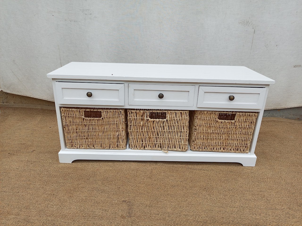 White indoor wooden,3-drawer,3-rattan basket shelf
