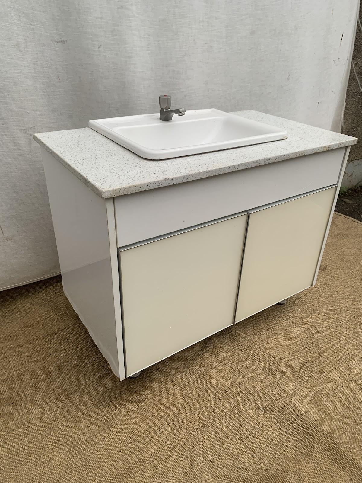Elevate your set design with this stylish white bathroom vanity, featuring a premium marble countertop.