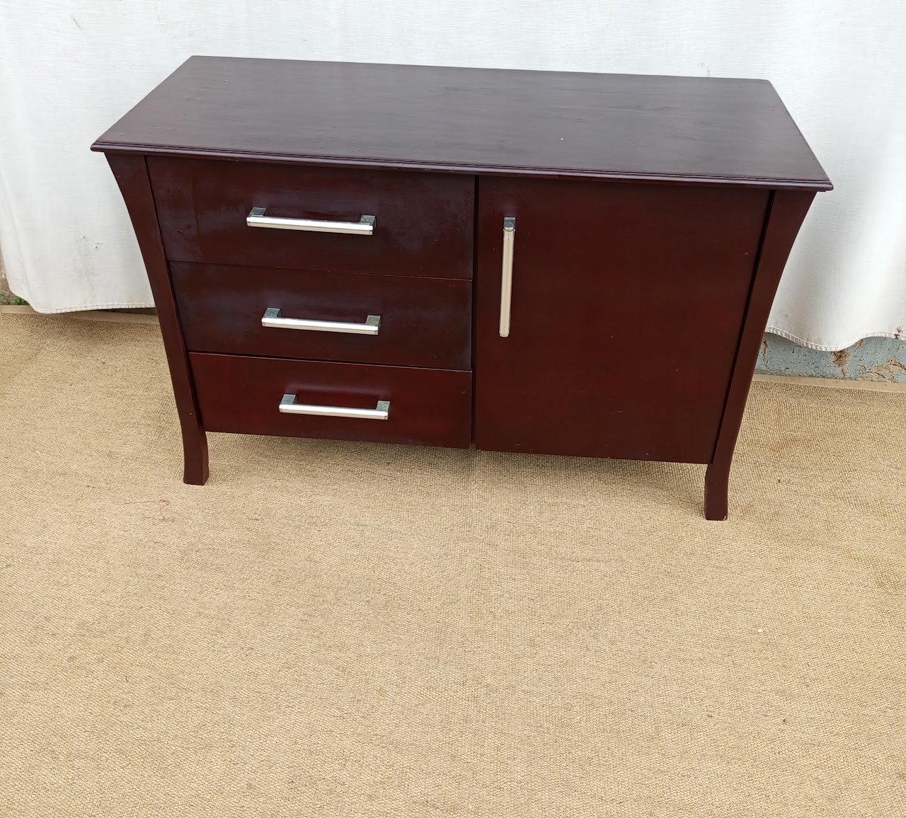 Add classic charm and practical storage to your space with this rental brown wooden vintage console table. Featuring three spacious drawers and a convenient door compartment, it offers ample room for organizing essentials while showcasing elegant vintage craftsmanship and a rich wood finish.