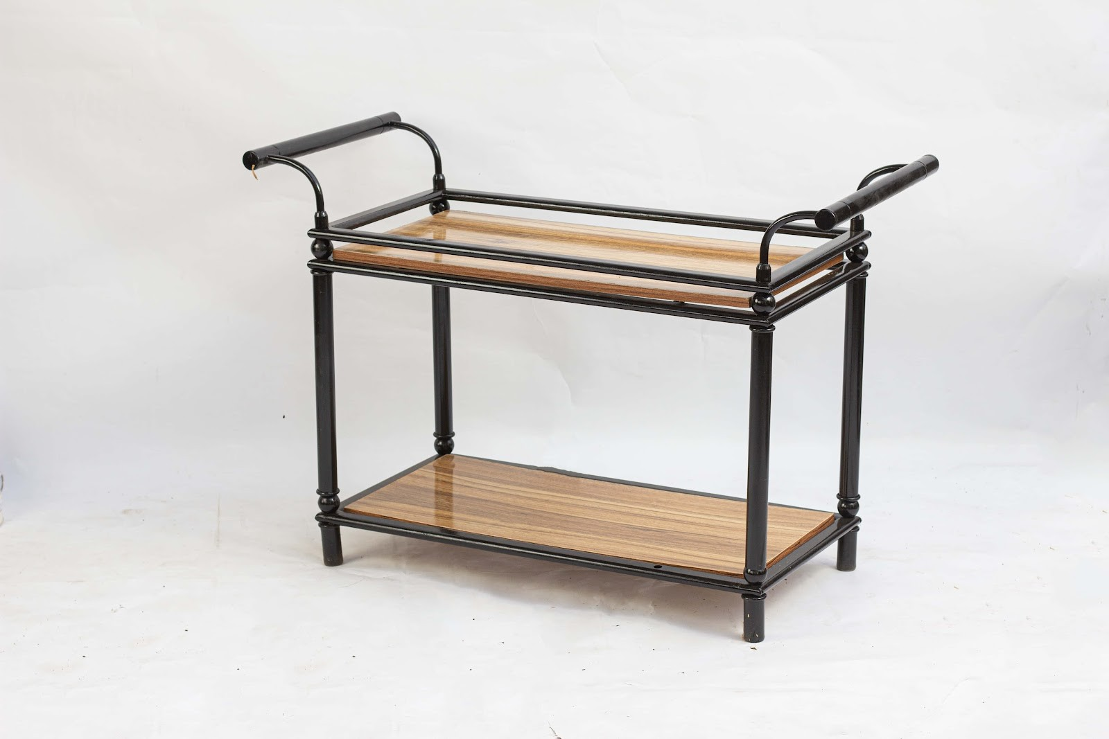 A versatile dining cart featuring a sleek black metal frame and sturdy stand.