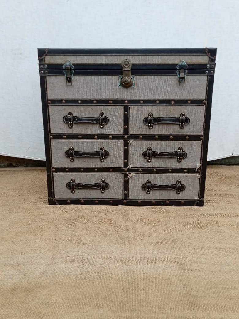 Add a touch of vintage elegance to your space with this large linen trunk-style chest, accented with luxurious dark brown leather, available for rent. Designed with spacious storage and sturdy construction, this trunk combines the soft texture of linen with the rich appeal of leather trim.