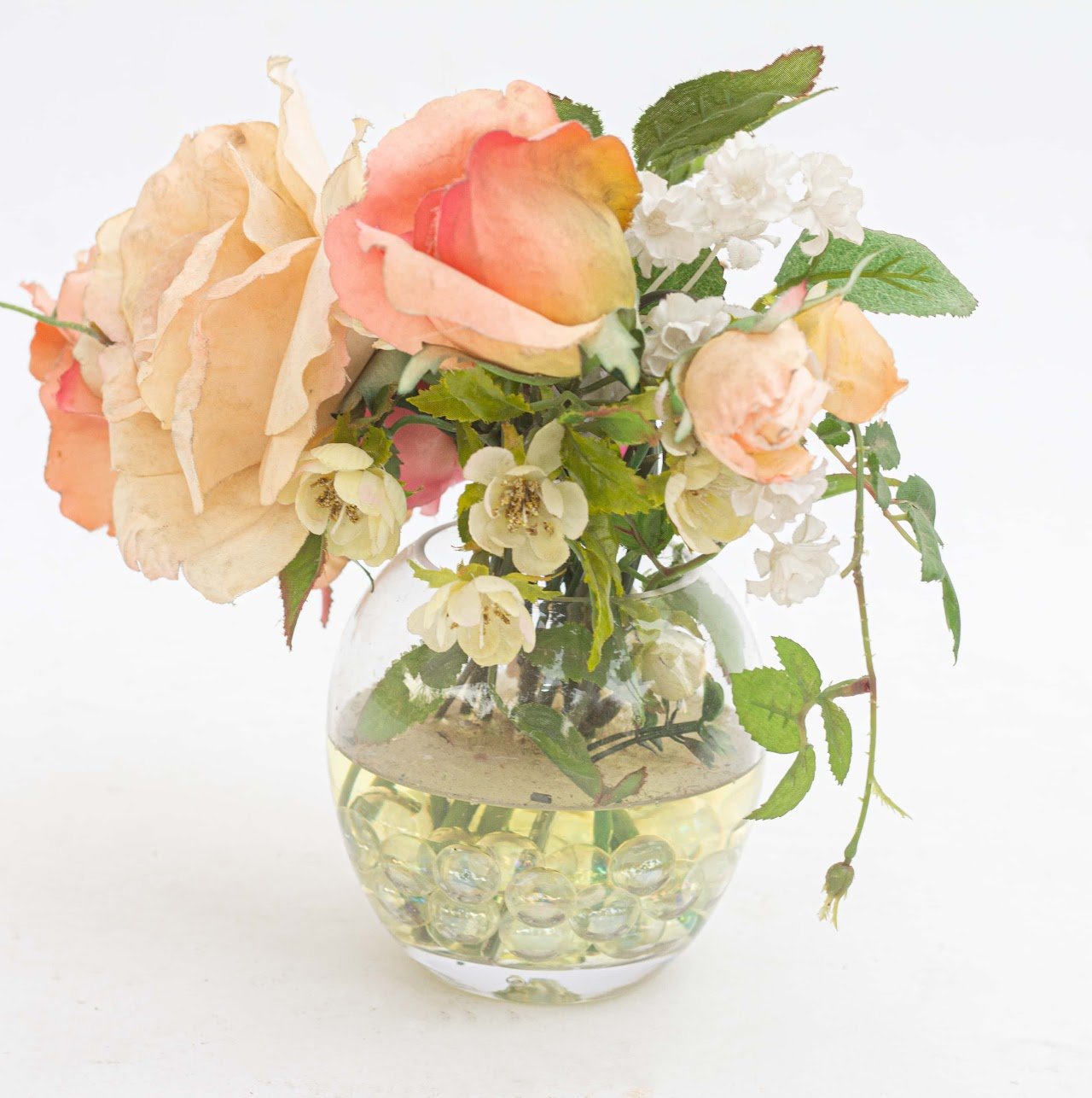Enhance your decor with this artificial flower and transparent glass vase set. Combining the clarity of a classic glass vessel with meticulously crafted faux blooms, this arrangement offers a fresh, natural look that stays perfect throughout your entire event without the need for water or maintenance.