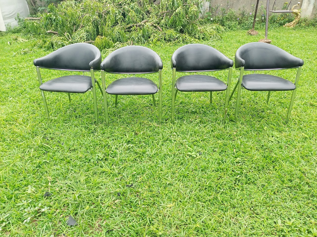 Elevate your event with our stylish dining chair, featuring a sleek black leather seat and sturdy metal stand with armrests. The premium leather provides a comfortable and sophisticated seating experience, while the modern metal frame adds durability and contemporary flair.