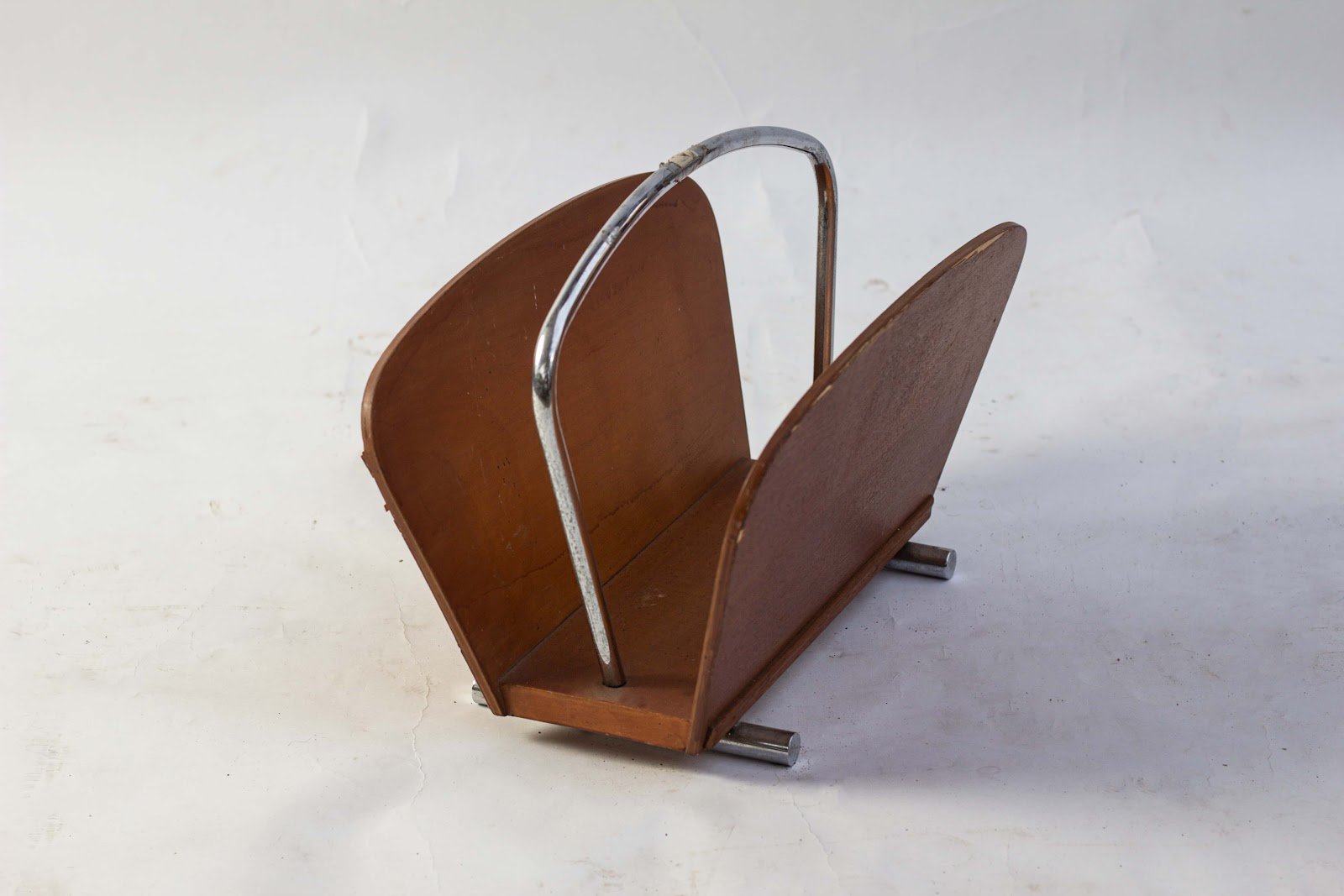 Vintage Mid-Century Wooden Magazine Rack/Record Holder with Metal Handle.