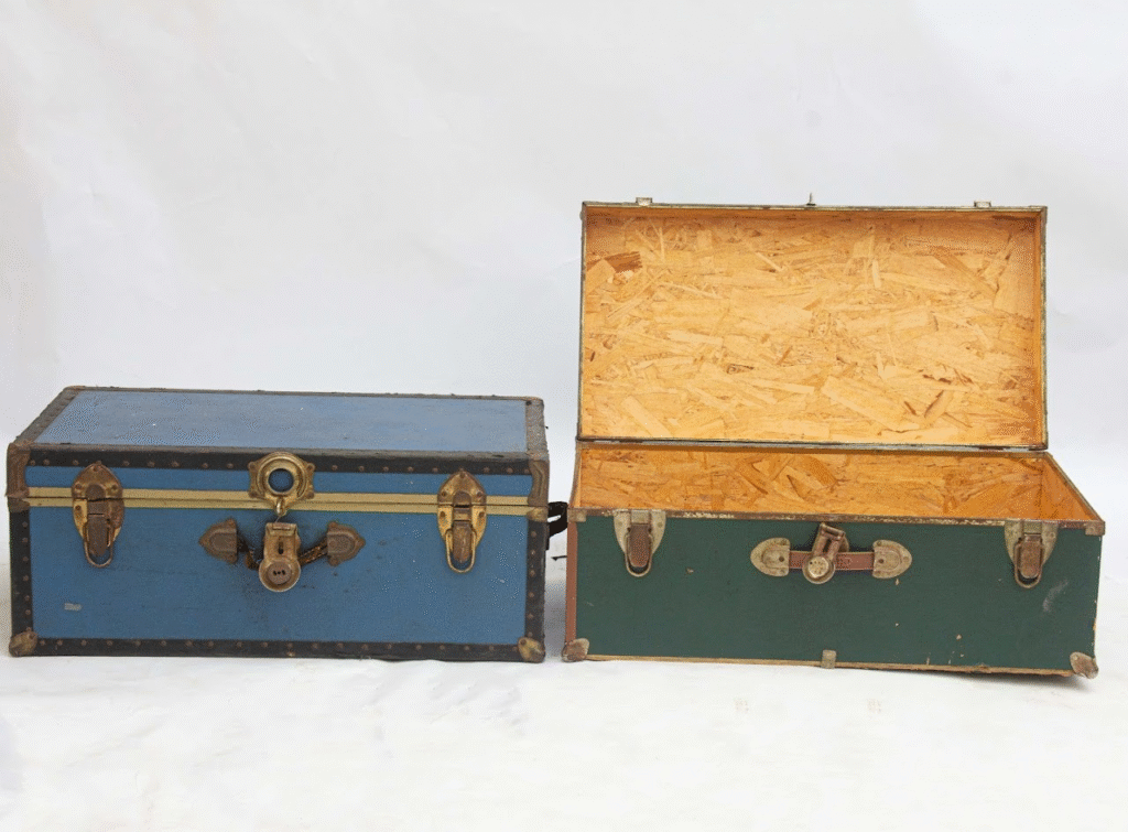 Featuring a classic hard-shell design, sturdy metal clasps, and a distinctive navy blue finish, this suitcase is perfect for period dramas, retro-themed photoshoots, or event displays.