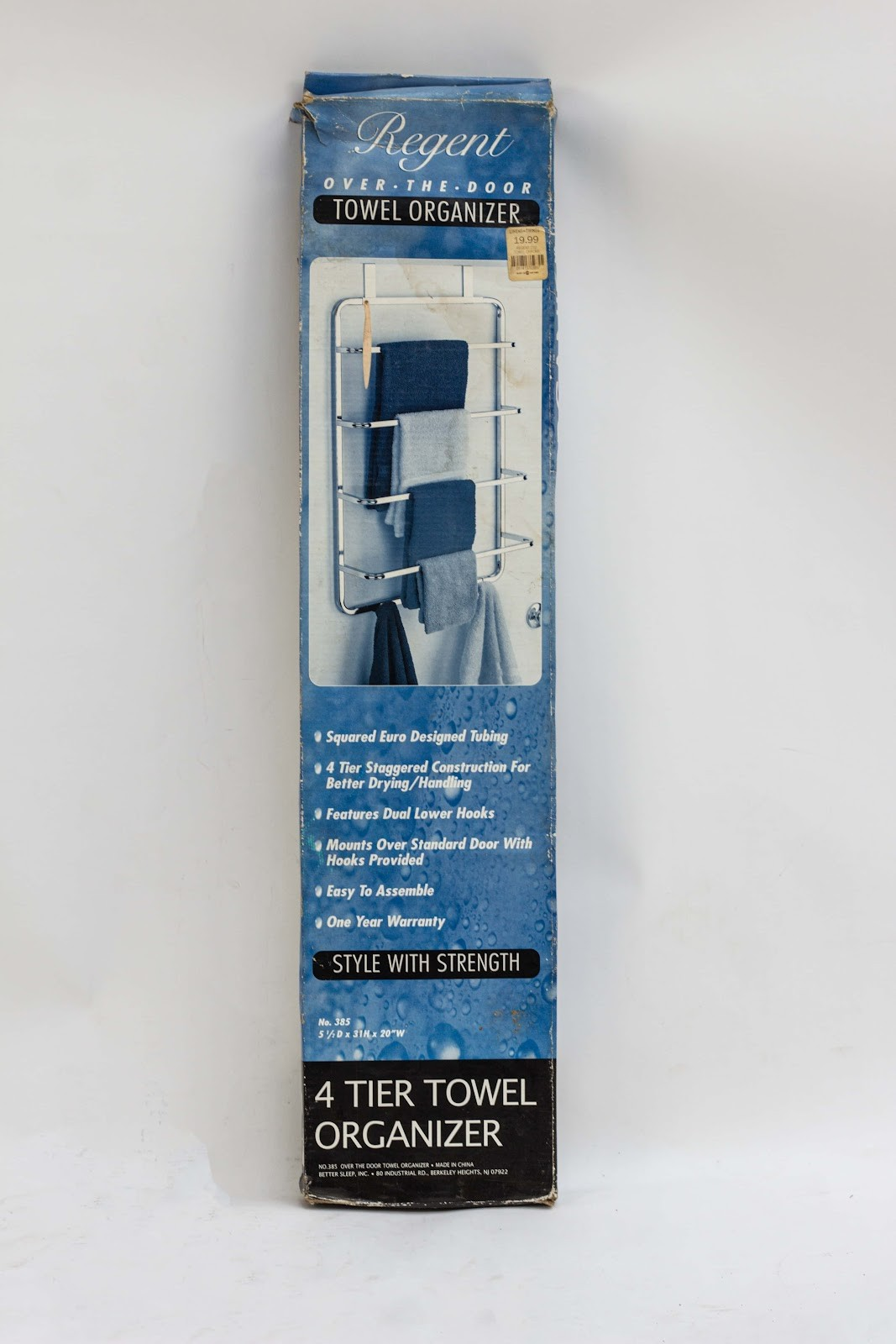 Add a touch of functionality and modern style to your set with this sleek metal towel organizer.