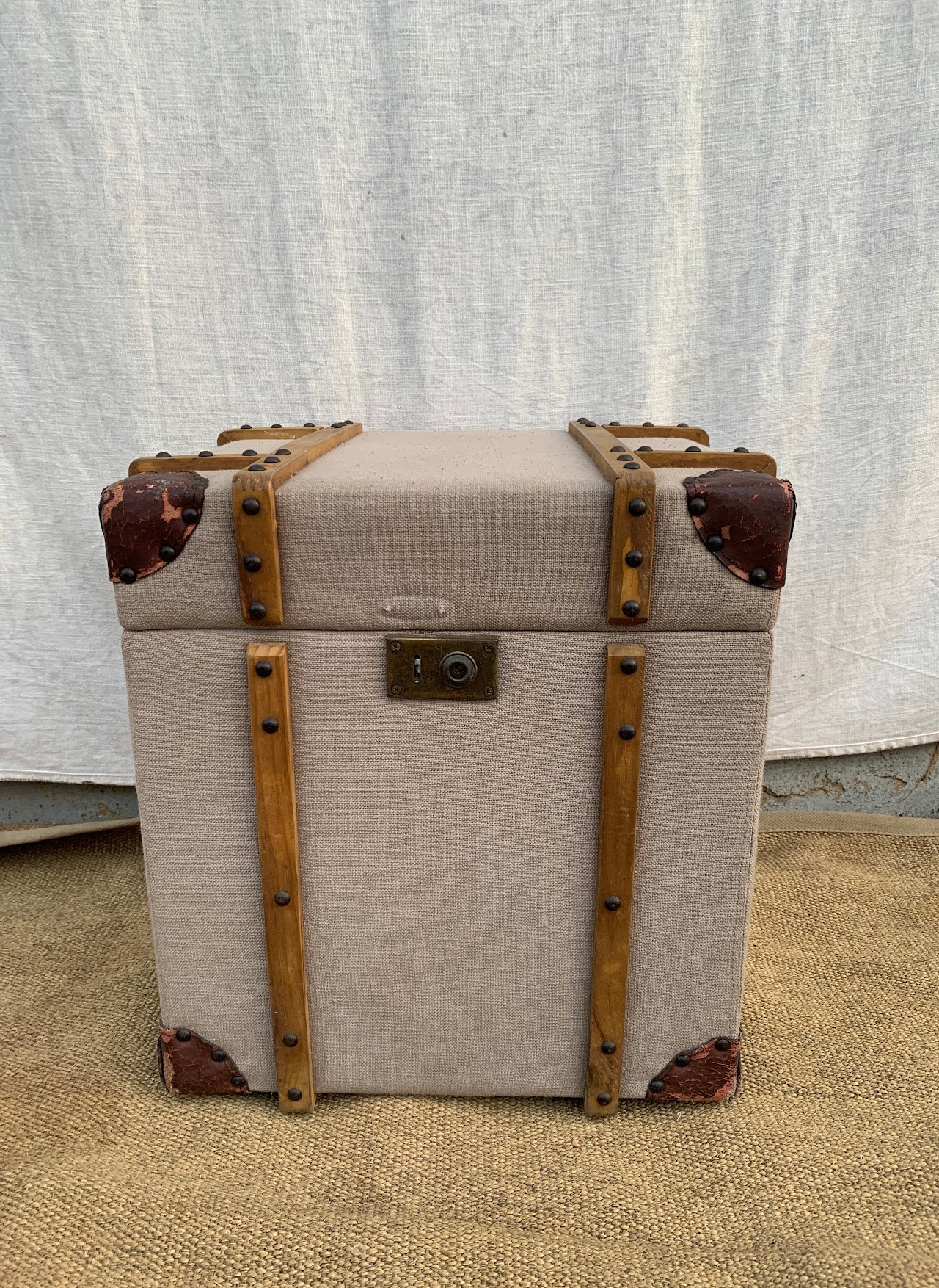 This classic trunk features a weathered grey finish with distinctive banded accents, offering both style and authenticity.