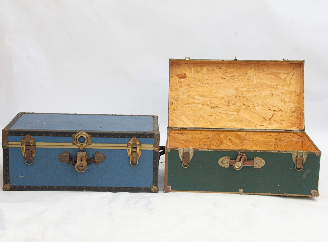 This set includes two vintage trunks, each with its own distinct color—one in bold blue and the other in rich green. Both trunks feature classic hardware, sturdy construction, and distressed finishes that evoke timeless charm and character.