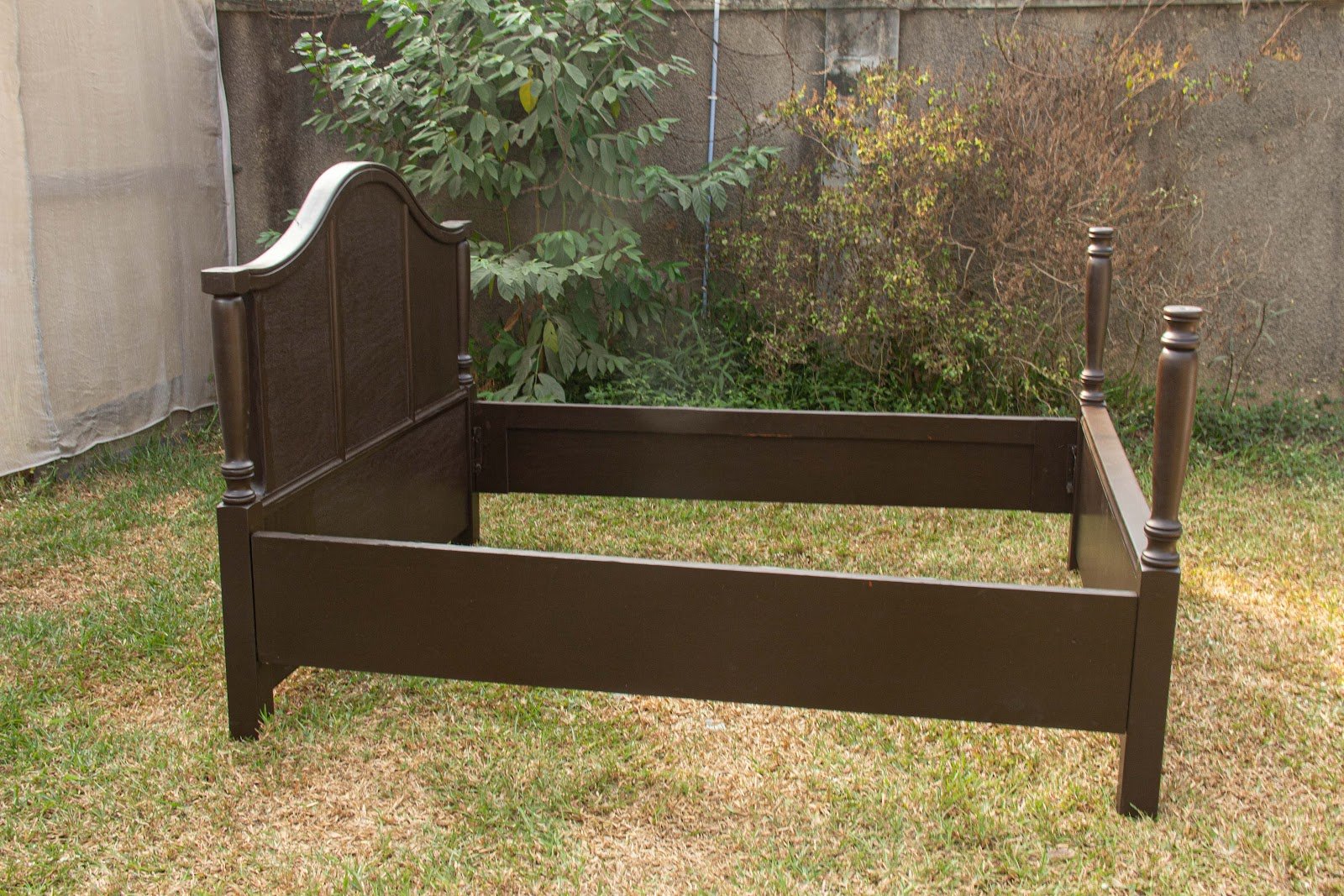 A dark brown wooden bedframe paired with a comfortable mattress, perfect for rental. The bedframe features sturdy construction and a rich, classic finish, adding warmth and elegance to any bedroom scene.